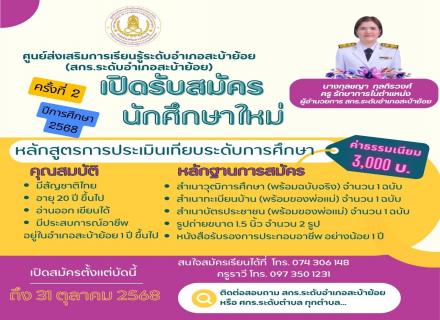 เทียบระดับการศึกษาเปิดรับสมัครแล้วนะครับ ด่วน!!!!! เปิดรับสมัครแล้วตั้งแต่วันนี้ ถึง 31 ตุลาคม 2568 ผ่านการประเมินครบจบการศึกษาแน่นอน สนใจติดต่อได้ที่ สกร.ระดับอำเภอสะบ้าย้อย 074 306148 หรือติดต่อ คุณครูวี 097 3501231 และ คุณครูล๊ะ 065 3218912  เข้าชม :  [8]