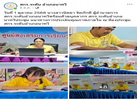 วันที่ 1 ตุลาคม 2568 นางสาวนิตยา จิตภักดี ผู้อํานวยการ สกร.ระดับอําเภอนาทวีพร้อมด้วยบุคลากร สกร.ระดับอําเภอนาทวีประชุม แนวทางการประเมินคุณภาพภายใน ณ ห้องประชุมสกร.ระดับอําเภอนาทวี
