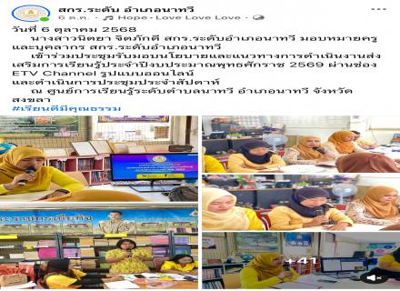 วันที่ 6 ตุลาคม 2568 นางสาวนิตยา จิตภักดี สกร.ระดับอำเภอนาทวี มอบหมายครูและบุคลากร สกร.ระดับอำเภอนาทวี เข้าร่วมประชุมรับมอบนโยบายและแนวทางการดำเนินงานส่งเสริมการเรียนรู้ประจำปีงบประมาณพุทธศักราช 2569 ผ่านช่อง ETV Channel รูปแบบออนไลน์ และดำเนิน