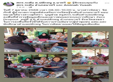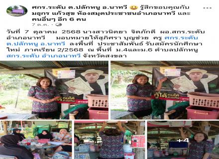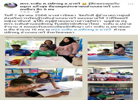 วันที่ 7 ตุลาคม 2568 นางสาวนิตยา จิตภักดี ผู้อำนวยการศูนย์ส่งเสริมการเรียนรู้ระดับอำเภอนาทวี มอบหมายให้ ว่าที่ร้อยตรีหญิงอามีนะห์ ยุโส๊ะ ครูผู้ช่วยและนางสาวสุภิศรา บุญช่วย ครูศกร.ระดับตำบลปลักหนู รับสมัครนักศึกษาใหม่ ระดับ ม.ปลายจำนวน 4 คนและรับลงทะเ