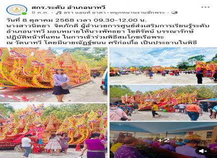 วันที่ 8 ตุลาคม 2568 เวลา 09.30-12.00 น. นางสาวนิตยา จิตภักดี ผู้อำนวยการศูนย์ส่งเสริมการเรียนรู้ระดับอำเภอนาทวี มอบหมายให้นางพัทธยา โชติรัตน์ บรรณารักษ์ ปฏิบัติหน้าที่แทน ในการเข้าร่วมพิธีสมโภชเรือพระ ณ วัดนาทวี โดยมีนายณัฏฐ์ชนน ศรีก่อเกื้อ เป็นประธาน