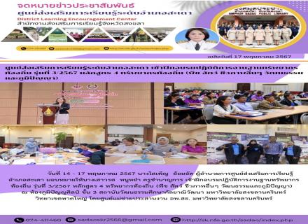 วันที่ 14-17 พฤษภาคม 2567 ดร.ไพโรจน์ คเชนทองสุวรรณ์ ผู้อำนวยการ สกร.ระดับอำเภอหาดใหญ่ มอบหมายให้ นางสาวหร่อมะ บิลนุ้ย ครู อาสาสมัครฯ นางสาวปั้นแก้ว ไพโรจน์ ครู ศกร.ระดับตำบลน้ำน้อย และ นายชัชนันท์ ชีวทรรศน์ ครู ศกร.ระดับตำบลคอหงส์ เข้าฝึกอบรมปฏิบัติการงาน |
