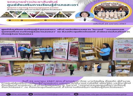 วันที่ 24 เมษายน 2567 นางจีรวรรณ์ ปัตตะพัฒน์ ผู้อำนวยการศูนย์ส่งเสริมการเรียนรู้อำเภอรัตภูมิ มอบหมายให้ บรรณารักษ์ สกร.อำเภอรัตภูมิ เข้าร่วมจัดนิทรรศการวิพากษ์วรรณกรรมชุมชนเพื่อการเรียนรู้จังหวัดสงขลา ณ ห้องประชุมทิพย์ดนตรี ศกร.จังหวัดสงขลา |
