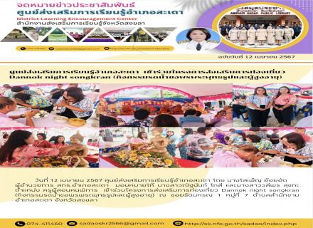 วันที่ 12-13 เมษายน 2567 ดร.ไพโรจน์ คเชนทองสุวรรณ์ ผู้อำนวยการ สกร.อำเภอหาดใหญ่ มอบหมายให้ คณะครู สกร.อำเภอหาดใหญ่ เข้าร่วมงานบุญสงกรานต์ สืบสานประเพณีปีใหม่ไทย จังหวัดสงขลา ประจำปี 2567 โดยได้มีการร่วมจัดร้านจำหน่ายสินค้าของดีของแต่ละ ศกร.ตำบล ของ สกร.อำ |