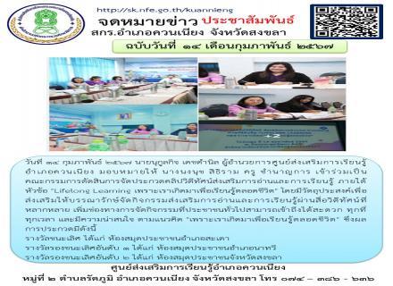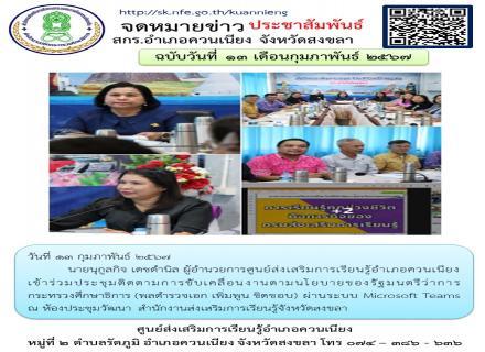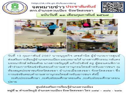 วันที่ 13 กุมภาพันธ์ 2567 นางสุนิตย์ ไชยถาวร ผู้อำนวยการ สกร.อำเภอนาหม่อม มอบหมายให้นางสาวสุภารัตน์ พรมชาติ นำนักศึกษา สกร.อำเภอนาหม่อม ทั้ง 3 ระดับ คือ ประถมศึกษา มัธยมศึกษาตอนต้น มัธยมศึกษาตอนปลาย เข้าร่วมแข่งขันตอบคำถามสารานุกรมไทยสำหรับเยาวชนฯ ระดับจั |