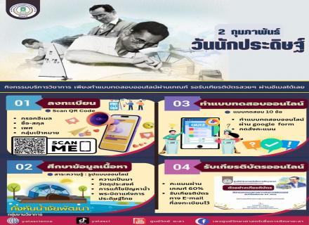 ศว.ยะลา ขอเชิญชวนทุกท่านร่วมกิจกรรม #บริการวิชาการ เพื่อเรียนรู้ความเป็นมาและความสำคัญของ #วันนักประดิษฐ์ ผ่านแบบทดสอบออนไลน์ #พร้อมรับเกียรติบัตรออนไลน์