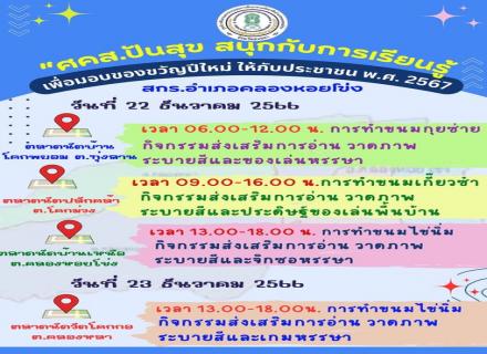 จัดกิจกรรม ศคส.ปันสุข สนุกกับการเรียนรู้ ระหว่างวันที่ 18-22 ธันวาคม 2566 เพื่อมอบเป็นของขวัญปีใหม่ให้แก่นักศึกษา และประชาชนในพื้นที่ |